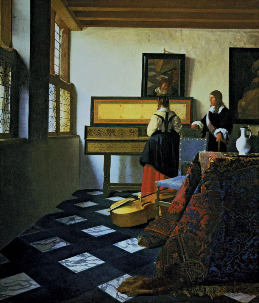 Vermeer was born in Delft. Delft tiles are a baseboard in the painting below. I had noticed this detail, but so did Wikipedia. The Music Lesson, below, shows a mise en abyme created by the mirror above the virginal. The word abyme suggests infinity. The mirror above the virginal does not reproduce the entire scene, but we see the face of the music student.